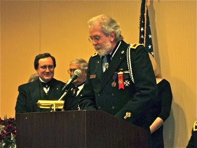 At podium, SK Duane Vaught, GCT, Grand Generalissimo of the Grand Encampment, PGC and MWPGM, begins the ceremony to elevate four Hoosier Sir Knights to the rank and honor of Knight Commander of the Temple for outstanding service to Templary, Freemasonry, or mankind. The honored knights, standing with their ladies, are, from left, Virgil Humphrey, Carson Smith, REGC James L. Dove, and MW Kenneth Willis, Grand Master of Masons of Indiana. Seated is the evening’s master of ceremonies, SK George Ingles, KCT, PGC and Senior Grand Warden of the Grand Lodge of Indiana, and his lady. [Photo by SK Charles Combi, from the Indiana supplement to the Knights Templar Magazine, March 2011]I'm still catching up on some stories from last month that fell between the stacks of stuff that clutter my desk like largish cluttering things.