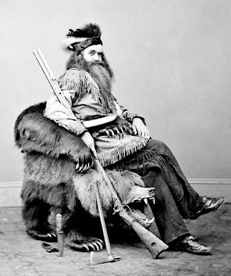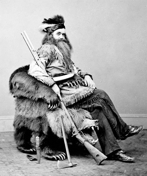 Seth Kinman sitting in a grizzly bear chair he presented to U.S. President Andrew Johnson, 1865