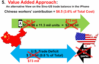 Chinese consumers want foreign goods. Whether sports shoes or cars, televisions or mobile phones, cosmetics or nappies [diapers to non-Brits], surveys show that foreign brands predominate. Shaun Rein of China Market Research Group says people trust foreign brands not to cut corners and associate them with more of an established heritage than their domestic labels.Moreover, there is the matter of "sham" trade surpluses (the image above comes from the ADB Institute): trade figures aside, once you adjust for the actual value-added of Chinese exports, the results look rather less impressive:This spells trouble for China as its people become more middle-class and spend more on non-essential items. The more that they buy foreign goods, the more that the proceeds of China’s progress will accumulate to shareholders elsewhere. It will also mean fewer profits for Chinese companies to reinvest in innovation and expertise at home in electronics, for example.