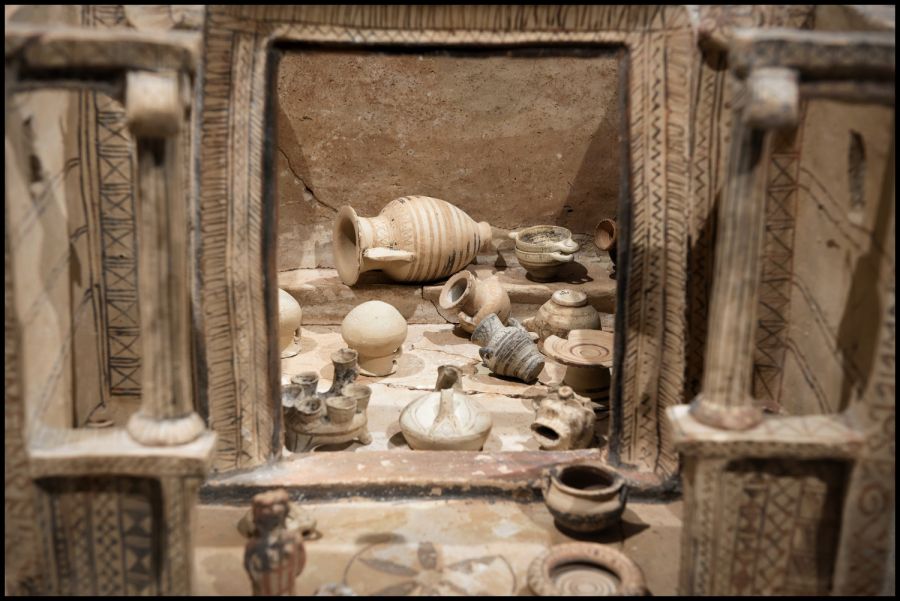 The exhibition’s second axis focuses on an iconic figure of Cycladic archaeology, Nikolaos Zaphiropoulos, who labored conscientiously until the end of his life, during periods critical for Cycladic antiquities and identity, having as his sole object the protection and enhancement of the islands’ archaeological wealth. His multi-faceted work includes the excavation of the cemetery of ancient Thera in Sellada, from which a selection of finds are presented here for the first time, including the impressive model of an oikiskos from a female burial that contained 103 objects – a Theran household of the age in miniature and perhaps the exhibition’s premier display.