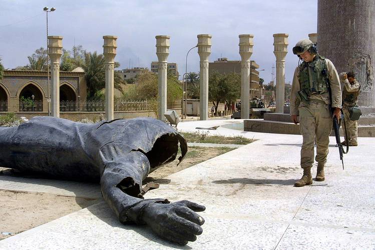 U.S. Marines walk past a famously dismantled statue of Saddam Hussein on Baghdad’s Firdos Square on April 10, 2003.