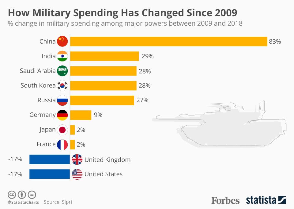 % change in military spending among major powers between 2009 and 2018. STATISTA